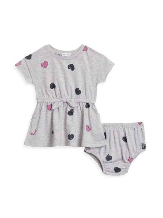 Contrasting heart graphics accent the dress and bloomers of this two-piece set. 60% cotton/40% polyester. Machine wash. Imported.