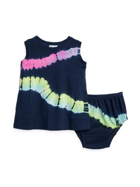 This two-piece set includes a jersey tie-dye print tank dress and matching bloomers. 60% cotton/40% modal. Machine wash. Imported.