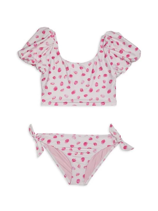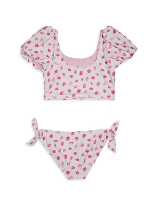 This two-piece polka dot-print bikini set features a top with puffy sleeves and bow details on the bottoms. Polyester/spandex. Hand wash. Made in USA.