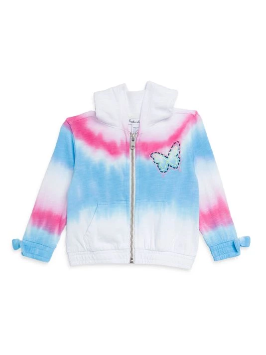 This jersey zip-up hoodie in a vibrant tie-dye print is embroidered with a butterfly motif on the chest and bow accents at the cuffs.