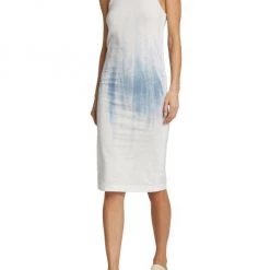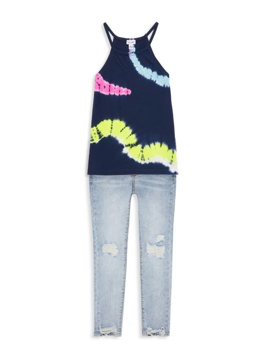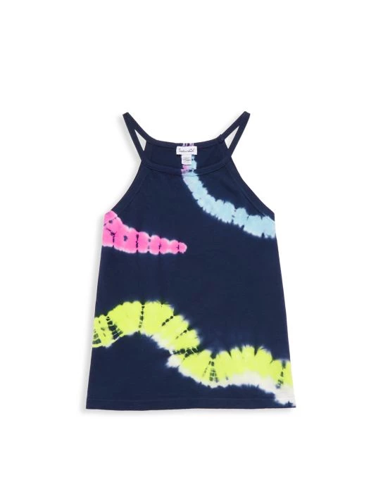 This sleeveless tank top in a rainbow-inspired tie-dye print features a halter neckline.