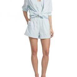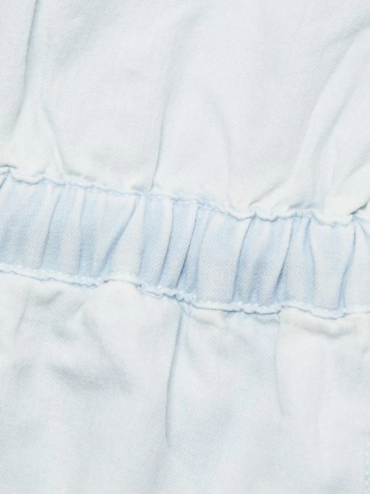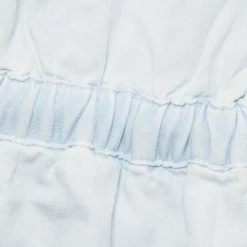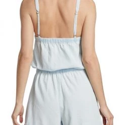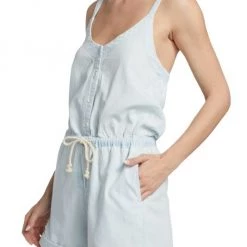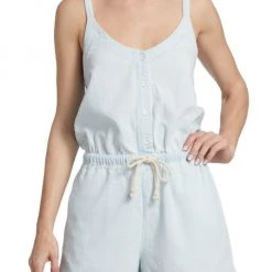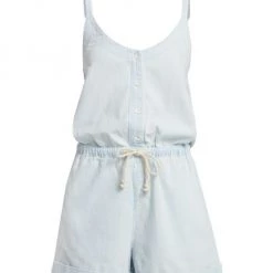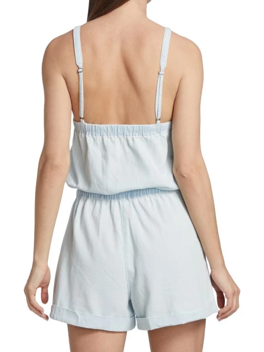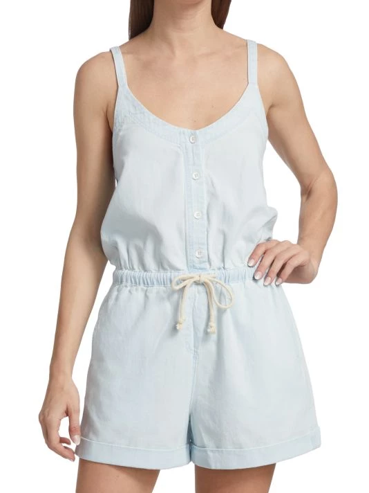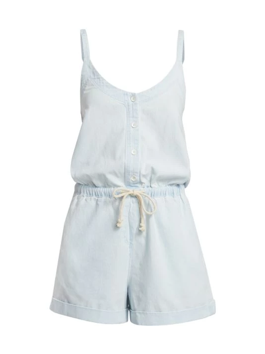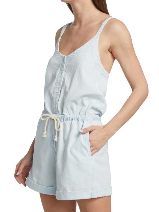 Crafted of denim, the Kit romper is designed in a sleeveless style with a drawstring waist.