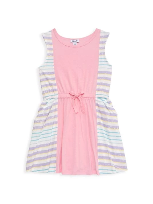 This sleeveless jersey dress in an intentionally faded striped print features an elasticated waistband and two slit pockets at the sides.