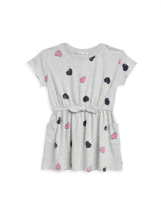 Bow ties and contrasting heart accent and a statement bowtie decorate this casual drawstring dress.