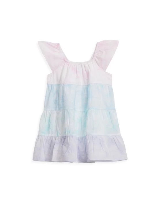 This tiered ruffle dress by Splendid is crafted of cotton poplin with adorable flutter sleeves. It flaunts colorblocked panels with a subtle tie-dyed effect.